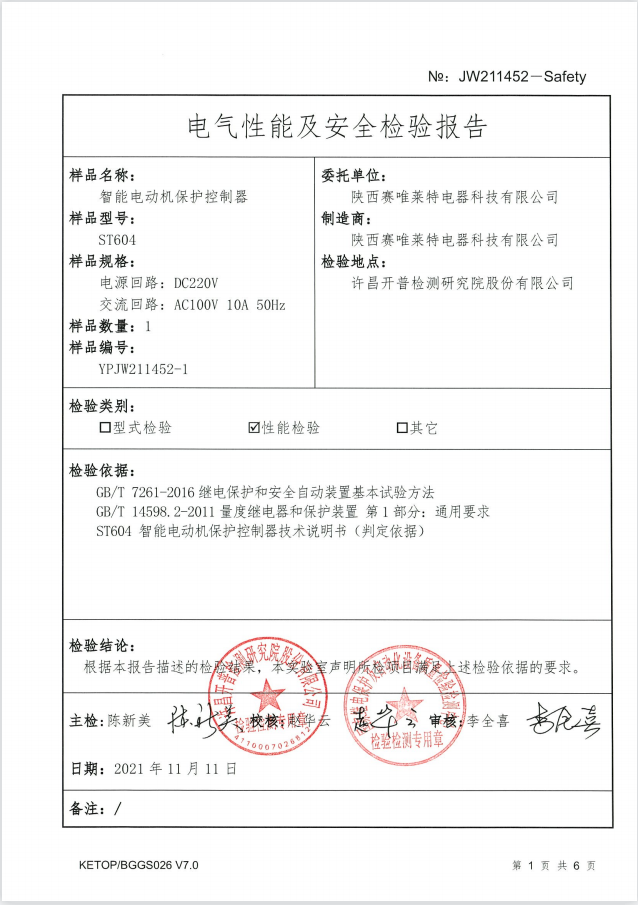 - ST604智能電動保護控制器電氣性能及安全檢驗報告