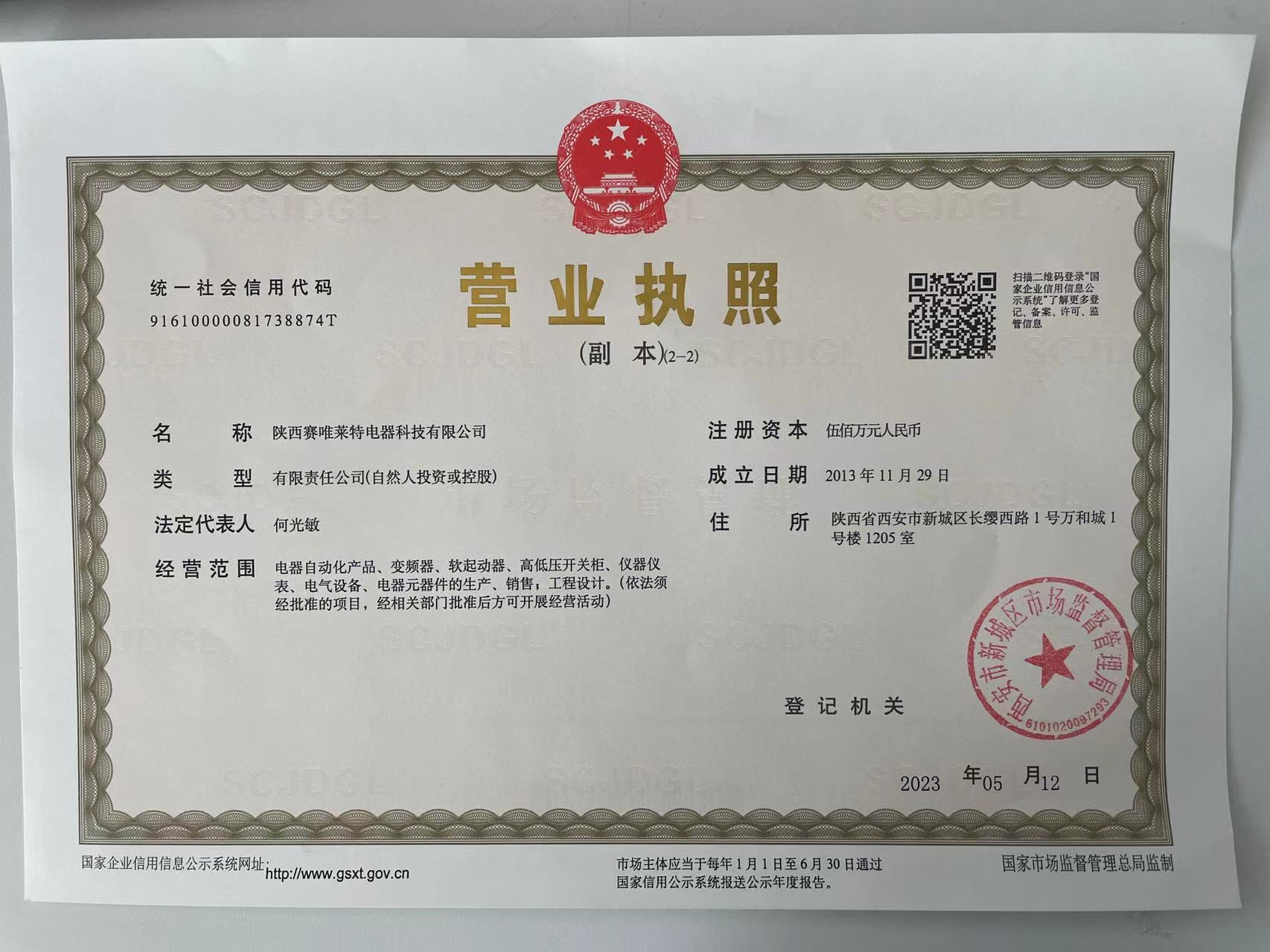 陜西賽唯萊特電器商標注冊證書